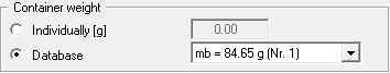 In the place of the input box "Container [g]" an extended group box is shown in the dialog box. After activating the "Database" option button the containers used can be selected from the drop-down combo box.