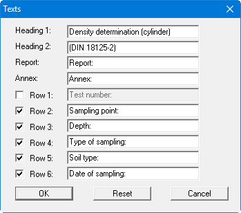 The default labelling of some output sheet elements can be edited in this menu item's dialog box. Among other things, the name of the output sheet can be specified here. Depending on the method selected for density determination in the menu item "Edit/New", the text boxes in the output sheet applicable to the selected method are displayed in the individual dialog boxes of this menu item and can then be adapted.