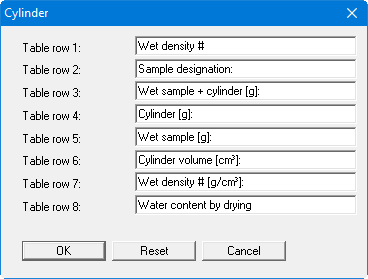 An option box opens for each method in which the various fields can be selected for editing using the correspondingly labelled buttons. For example, the following dialog box appears if the "Cylinder (Proctor)" density determination method is selected: