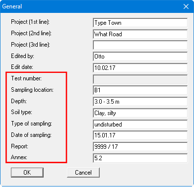 The marked texts in the dialog box also appear in the output sheet. Input boxes can be altered or switched off such as "Test number:" as shown in the above dialog box by going to the menu item "Output preferences/Texts" button "Output sheet" (see Section 5.4.2).