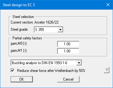If the steel design has not already been requested in the analysis boxes, you will see a query on the steel design after the analysis is complete. In some of the load cases, you can carry out the design for the selected section or have the program search for the optimum section. You will see the dialog boxes that can also be accessed via the "System/Design defaults" menu item.