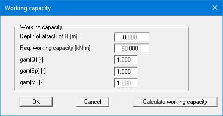 Here, too, you can either enter the required working capacity or have it determined and entered by the program using the "Calculate working capacity" button (see descriptions in menu item “Editor 1/General load cases”). In this example, the program then performs an analysis by varying H,q,k and displays the results in a message box: