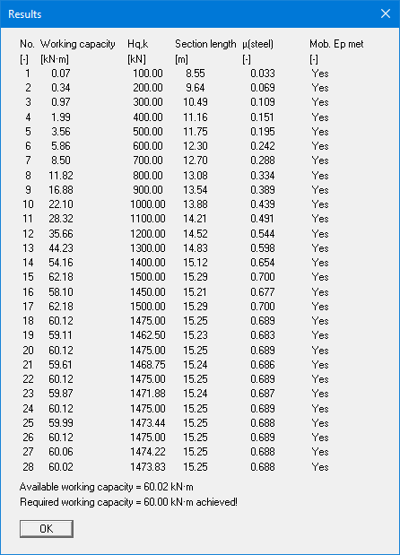 In this case, the required working capacity has just been reached. If the steel cannot be verified, the analysis is aborted.