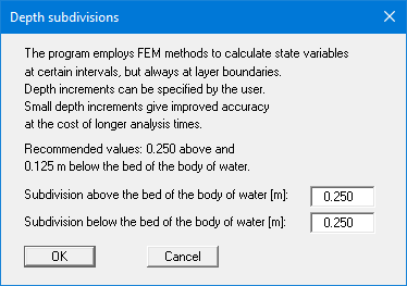 GGU-DOLPHIN uses the finite element method, which requires the system to be divided into a number of finite elements (rods). You can specify the size of these depth increments for the region above and below the bed of the body of water.