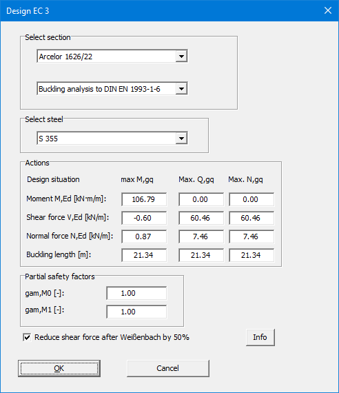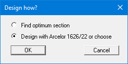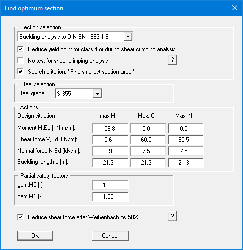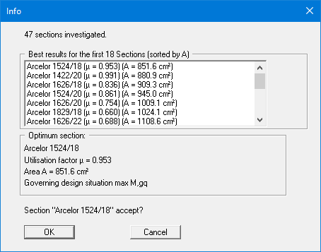 If this has not already been done during the analysis, you can subsequently design the steel using this menu item. If you use a selected section, you may also be able to have the program search for an optimal section: