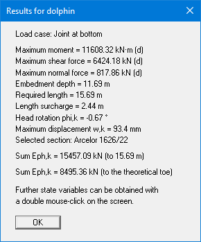 After selecting this menu item or pressing the [F6] key, you will see a message box containing governing system analysis variables. If analysing using "General load cases", the result of the load case with the greatest steel utilisation is shown.
