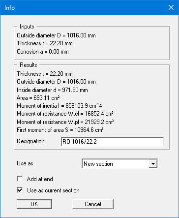 A new tubular section can be generated. A dialog box opens for entering the dimensions and identification. In the following dialog box you can then save the section as a new section, or using a previously allocated name: