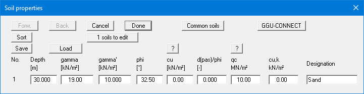 Using the "Common soils" button, you can easily select the soil properties of many common soils from a database or determine intermediate values.