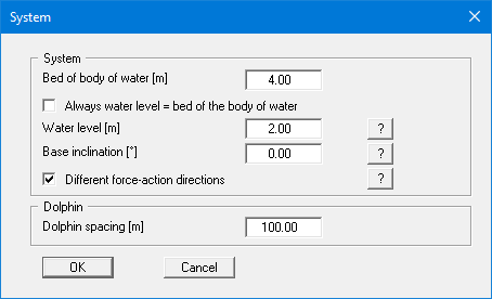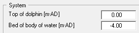 Your system is defined using this menu item. Enter the bed of the water body and the water level positive downwards in m below top of dolphin (= 0.00 m).