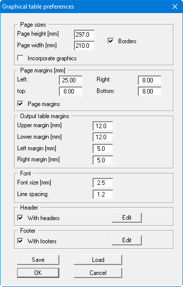 In the various group boxes of the dialog box, you can define preferences for the table output and layout. By activating the "Incorporate graphics" button, a sketch of the system is integrated in the output table. If you need to add a header or footer (e.g. for page numbering), activate the appropriate check boxes "With headers" and/or "With footers" and click on the "Edit" button. You can then edit as required in a further dialog box. You can save your settings for the graphical output table presentation in a "Protokoll.pin_ggu" file at the program level so that they are loaded when the program starts. Using the "Load" button, the output table settings can also be subsequently loaded into an existing file, including that of another GGU program.