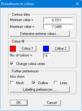 The "Determine extreme values" button computes the minimum and maximum drawdowns and enters them into the appropriate input boxes. However, you need not retain these values, but can also define your own. No smoothing of the contour lines can be performed here."Colour fill" group box