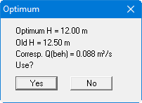 Enter a minimum and a maximum well depth H, between which the program is to vary. With the input for "Delta H" you define the variation separation. Below this, you can determine whether or not a minimum drawdown at the most unfavourable point is to be adhered to. Well depths which do not keep this condition when this check box is activated will not be accepted. Once optimisation is complete the result is displayed and the optimised well depths can be accepted for further use. The optimised system should then be reanalysed.