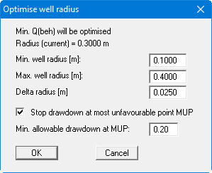 In analogy to well depth optimisation, you enter the range of variation for the program here via a minimum and a maximum well radius. The input following "Delta radius" is used to define the variation spacing. Below this, specify whether a minimum drawdown should not be exceeded at the most unfavourable point. Well radii that do not adhere to this condition when the check box is activated are rejected. Once optimisation is complete the result is displayed and the optimised well radius can be accepted for further use. The optimised system should then be reanalysed.