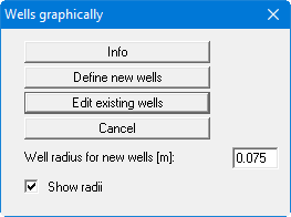 Select the "Info" button to see information on graphical determination of well positions. If you want to edit a current well installation by adding or deleting of individual wells, select the "Edit existing wells" button. If, at first, all current wells should be deleted, select the "Define new wells" button. You can then position new wells by clicking the left mouse button or, by clicking the right mouse button, delete current wells. By activating the "Show radii" check box, the well radii will entered in the graphical display, otherwise the numbers of the wells are displayed in the graphics (see menu item "Edit/Visualisation").