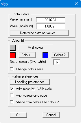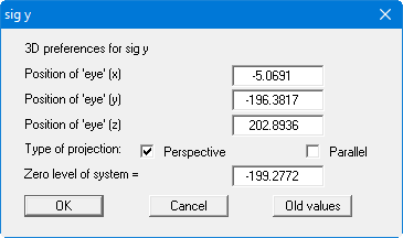 With this menu item you can have lines of equal state variables for the current nodes displayed three-dimensionally. In the following dialog box you can select from perspective and parallel projection, as well as selecting the position of the "eye". The values are displayed above and below the base level (z ordinate) in three dimensions.
