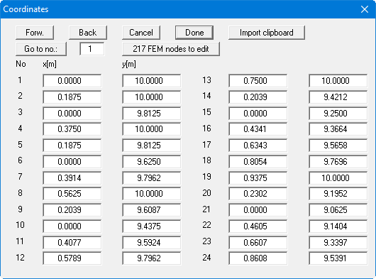 If you need to edit the current number of nodes click the "x FEM nodes to edit" button and enter the new number of nodes. You can navigate through the table using "Forw." and "Back".