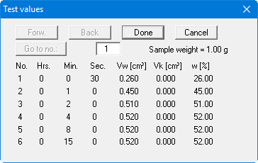 A dialog box opens showing the test data entered and the calculated water contents. The button functions are identical to those of the "Edit test data" dialog box.