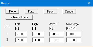 Enter the x-ordinate of the toe and the head. Define the height of the berm with "delta h". Negative values are also allowed here. Finally, a surcharge load can be specified for the horizontal area behind the head of the berm.