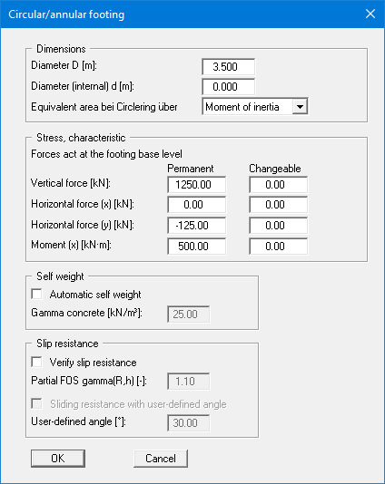Enter the diameter shown for the circular footing. The analysis is performed on an equivalent area for an annular footing (see "Theoretical principles: Theoretical principles for circle/annulus"). According to the partial safety factor concept, you can define differing stresses for permanent and changeable loads.
