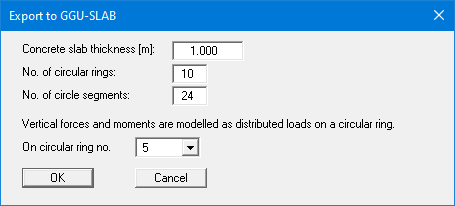 With the number of circular rings and circle segments you specify the density of your finite elements in GGU-SLAB. In the case of an annulus, the lower section of the dialog box also appears. Here you specify on which of the circular rings the vertical forces and moments are to be modelled as distributed loads.