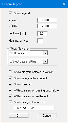 In the General legend you can, if wished, display information on the program (name and version), on the adopted standard, safety factor concept, design situation and on the current file (name, path, time info). Any project identification entered in the "File/New" or "Edit/Project identification" dialog box will be shown automatically in the General legend.