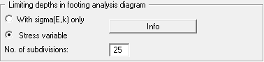 The settlement curves in the footing analysis diagram are attained from the footing pressure by linear interpolation. Thus, analysis using the x%-criteria only takes place for the maximum footing pressure of each footing width. However, if you open "Edit/Analysis options" menu item and activate the "Stress variable" check box, the limiting depth is calculated for a number of stresses (here for 25 stresses).