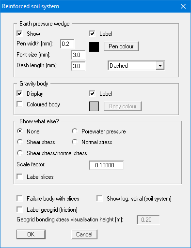 The earth pressure wedge and gravity body are explained in section 7.21.2. The visualisation of these elements can be influenced in the two upper group boxes of this dialog box.