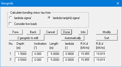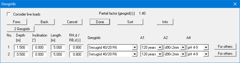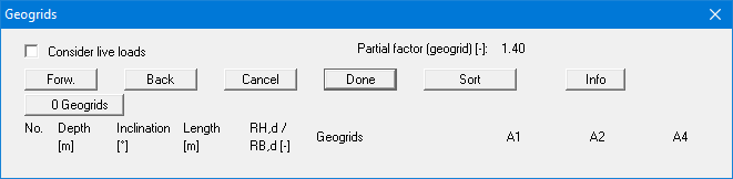 A maximum of 8 geogrids are shown in the list. You can navigate through the list using the "Forw." and "Back" buttons. Using the "Sort" button, you can sort the geogrids according to depth. For example, if you wish to delete the top geogrid from the table simply assign a very small depth (e.g. "-100") and press "Sort". The geogrid has now moved to the lowest position in the table. Now reduce the number of geogrids by 1.