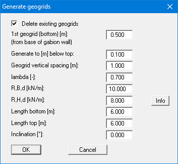 Define the position and material properties of geogrids using this menu item. The defined geogrids are displayed after closing the dialog box.