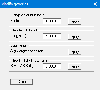 Using this menu item, you can edit the data for all geogrids simultaneously in a single step. Enter a value and start the modification using the respective "Apply" button following the desired action. Only this action is subsequently performed.