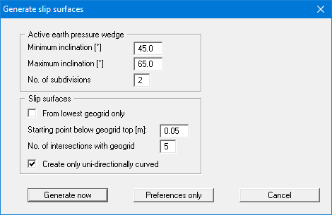 The effects of the individual inputs are difficult to describe in words. So just try editing the input in the dialog box and then click "Generate now". You will see immediately the failure mechanisms generated by the program in the graphics. If you close the dialog box using the "Preferences only" button, the current analysis results will not be affected. However, when you start a new analysis that includes geogrids these settings will be used to generate the appropriate failure mechanisms.