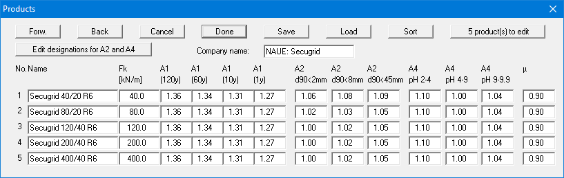 The required company product can then be selected for each of the geogrids. The coefficients defined for a geogrid, the length and the inclination can be adopted for the remaining geogrids by using the "For others" button.