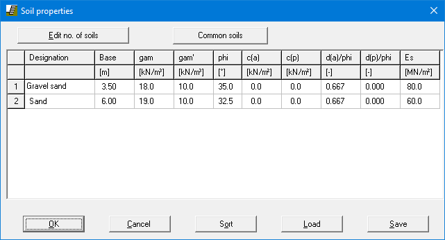 Enter the values given in the above dialog box. You can enter differing cohesion and angles of friction for the active (a) and the passive sides (p).