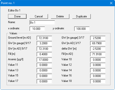 You can now edit the data point name, the x and y coordinates and the associated 18 values. If you would like to enter a specific value for all existing data points, it is better to go to the menu item "Edit/Individual values", because here all data points with only this one measured value are listed for data entry.