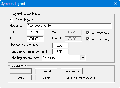 After clicking the "Colour + legend preferences" the following dialog box opens for specifying legend preferences; these were previously explained in the menu item "Graphics preferences/Symbols legend".