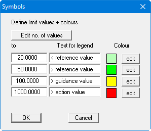 An additional limit value can be defined or the number reduced using the "Edit no. of values" button. The texts can be adapted to your requirements and the colours assigned to the respective values via the "edit" button. Because only one value can be selected for the symbol chart, the limit values are entered directly, in contrast to the value-dependent bar chart. The changes are accepted via "OK" and you return to the above dialog box. The preferences can be saved in a file with the ".leg" extension. If the file is saved in the program folder (default) the preferences will be automatically loaded the next time the program is started.
