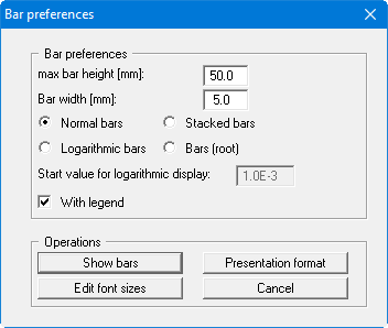 Using the "Presentation format" button it is possible to alter the settings for bar presentation in analogy to the description given in the menu item "Graphics/Contours (normal)" (see Section "Presentation format" button). A heading can be entered in the preferences dialog box; this is used as the heading for the general legend If the "Bars coloured" check box is activated in the settings box the bars are visualised using the value colour of the selected data. Changes can be made by going to the menu item "Edit/Value colours".