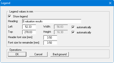 Input here defines the upper left corner of the legend box. The "automatically" check boxes should always be activated for specifying the width and height, because the size of the legend is then adapted to the number of measured data points and the length of the measured data designations. The font sizes for the heading and the measured data names can also be specified, as well as selecting a background colour for the legend.