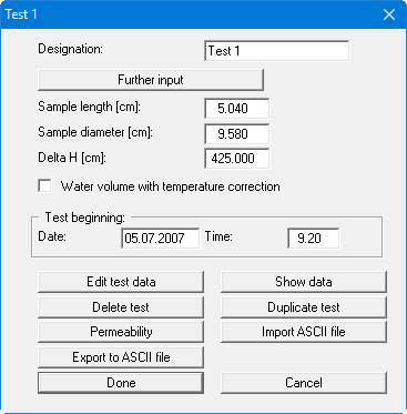In the input boxes define the sample via length, diameter and delta H. By activating the "Water volume with temperature correction" check box, a temperature correction can be accomplished for test evaluation. Date and time of the test beginning can be entered below.
