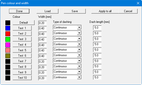 The pen width, line type and dashing can be edited for the permeability graphs and, after clicking the buttons with the test numbers, the pen colours be adapted. The pen preferences can be saved as an ".stf" file, or be loaded from such, using "Save" and "Load", in order to give a variety of pen combinations.