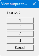The default screen visualisation depicts your permeability tests. Change to output table visualisation using the "View output table" menu item. If several tests have been conducted, the following dialog box will first appear, in which you select the respective tests for output table visualisation using the buttons "1", "2", etc.