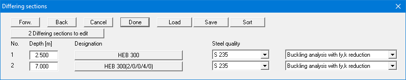 If you are working with differing sections, you specify the steel grade and buckling analysis for the individual sections in the dialog box for this menu item.