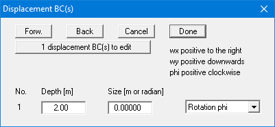 In the above example, a rotation phi of 0.0 has been entered 2.0 m below the top of the pile. Alternatively, to "Rotation phi" you can select "Displ. wx" or " Displ. wy", which stand for horizontal and vertical displacement, respectively.