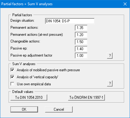 In addition, there is a seismic design situation (DS-E). In the DS-E design situation all partial factors = '1.0'. It is also possible to select the partial safety factors compliant with Austrian standards using the "To ÖNORM EN 1997-1" button.