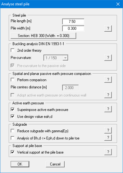 The pile length and pile width were adopted from the "Editor 1/System input" dialog box. If you would prefer to use a different section, click the "Section: …" button and select the required section from the list of sections displayed. Confirm the input by pressing "OK".