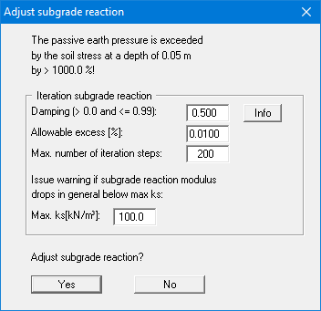 The program has determined that the passive earth pressure is smaller than the resulting soil pressure from the elastic analysis, which is not permitted. Therefore, confirm the question about iteration with "Yes". In the dialog box shown above, you can enter the iteration conditions. The default values have proved themselves in practice and will generally not need to be altered.