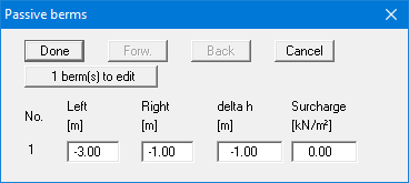 Go to the "Editor 1" menu and select "Berms (passive side)". Click "0 berm(s) to edit" and enter the number 1. Enter the following values and click "Done".