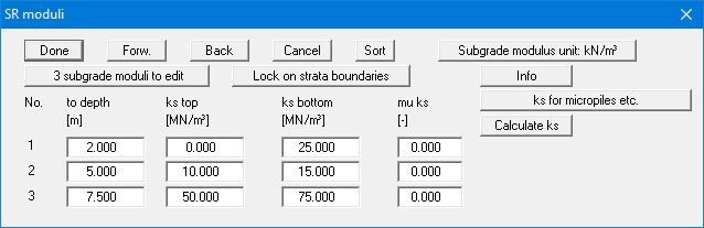 As the analysis is to be performed for an elastically embedded pile toe, it is necessary to enter a modulus of subgrade reaction. In this dialog box you can enter the profile of the subgrade reaction moduli.