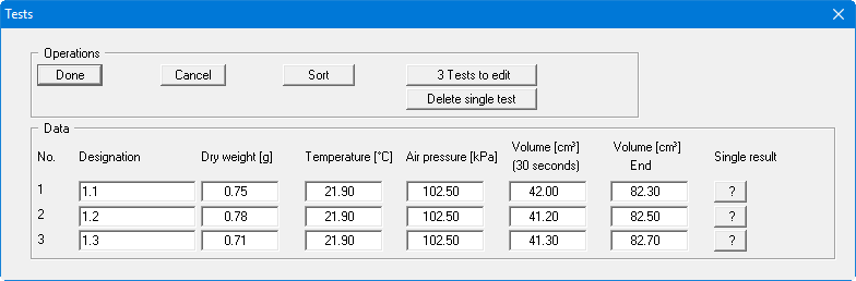 This example contains three single tests, each represented by an input row. The automatic numbering of the tests defines the sequence in the table. You define the number of input rows needed using the "x Tests to edit" button.