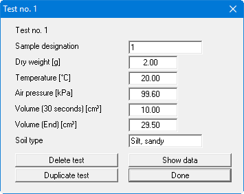Further input boxes for entering additional information (e.g. soil type) can be defined using the menu item "Output preferences/Table texts + allocations" . If you have used this option you will no longer see the test input dialog box shown above. Each individual test is opened separately via a button with the automatically allocated test number: